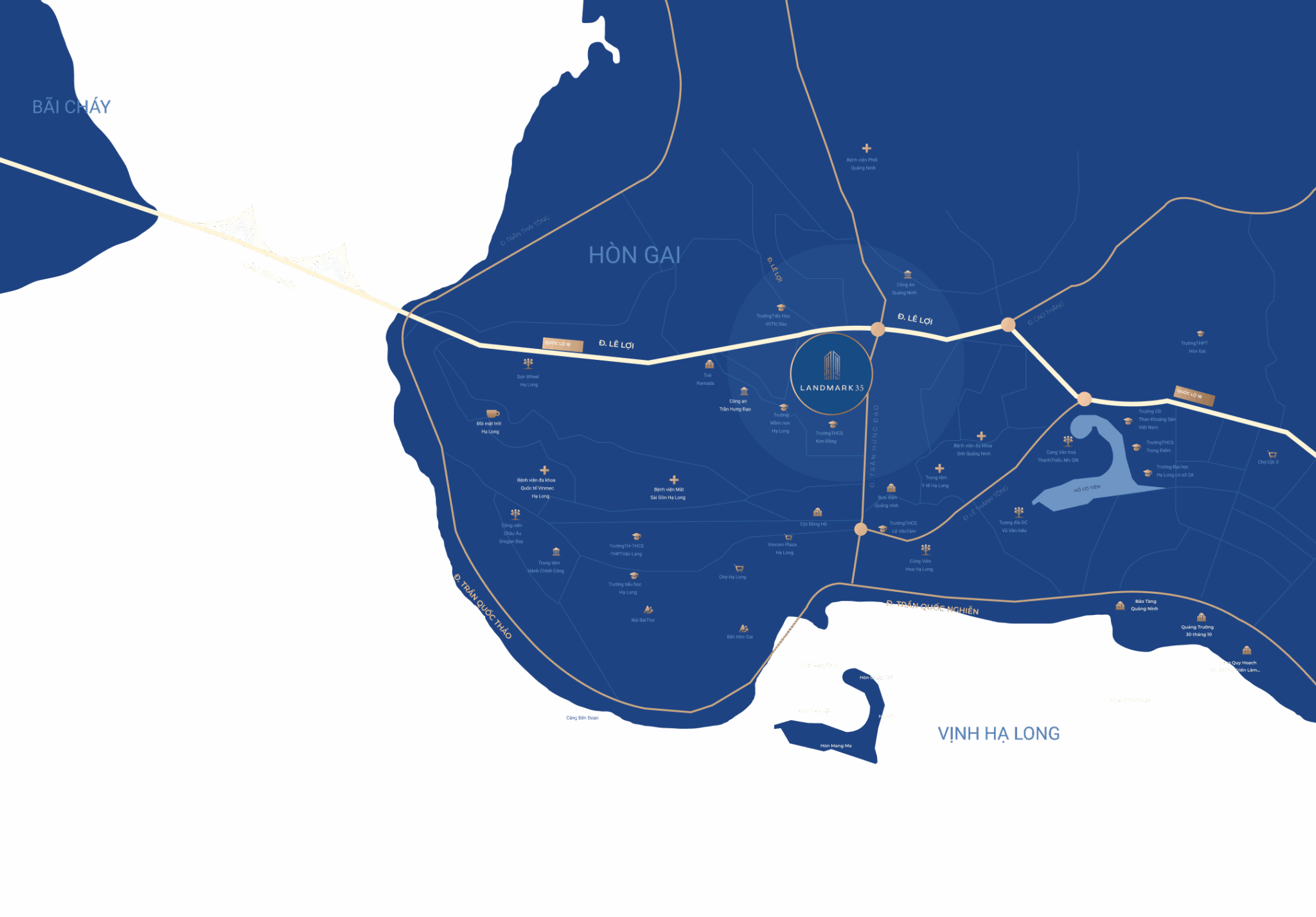 Vị trí chính là “linh hồn” của mọi dự án bất động sản, và Landmark 35 Trần Hưng Đạo sở hữu lợi thế vượt trội khi nằm ngay tuyến đường huyết mạch – được mệnh danh là “đại lộ tài chính” và “trung tâm mua sắm” của Hạ Long. Dự án tiếp giáp các trục đường quan trọng, tạo nên điểm nhấn kiến trúc biểu tượng, góp phần định hình diện mạo mới cho thành phố bên bờ Vịnh Hạ Long.